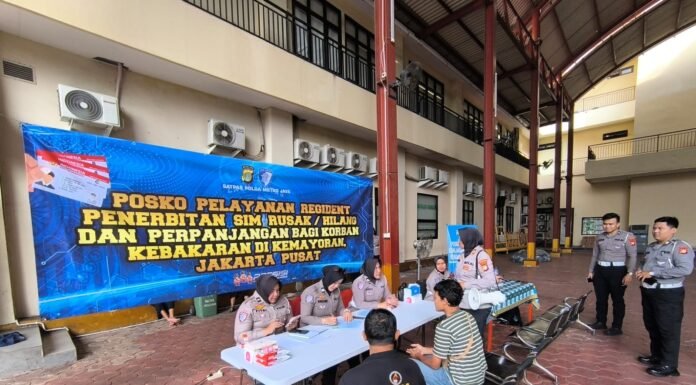 Jakarta. Ditlantas Polda Metro Jaya menggelar pelayanan kemanusiaan di Posko Bencana Kebakaran Kemayoran, Jakarta Pusat. Kali ini pelayanan kemanusiaan dilakukan dengan menggelar posko pelayanan SIM yang rusak, hilang, dan perpanjangan...