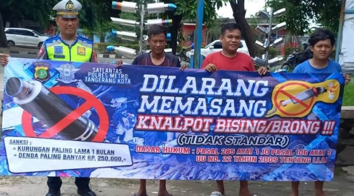 Kota Tangerang,koranpelita.co – Kepolisian Resor (Polres) Metro Tangerang Kota, Polda Metro Jaya melalui Satlantas melakukan sosialisasi larangan sepeda motor menggunakan knalpot brong atau tidak standar pabrikan.