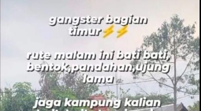 Telah beredar berita HOAX dari Status media Sosial yang memposting sebuah foto dengan tulisan "Gangster bagian timur, rute malam ini bati bati, bentok pandahan, ujung lama,...