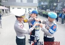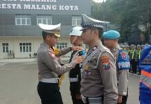 Kasat Lantas Polresta Malang Kota, Kompol Aristianto Budi Sutrisno menyematkan tanda pita kepada anggota yang terlibat dalam Operasi Keselamatan...